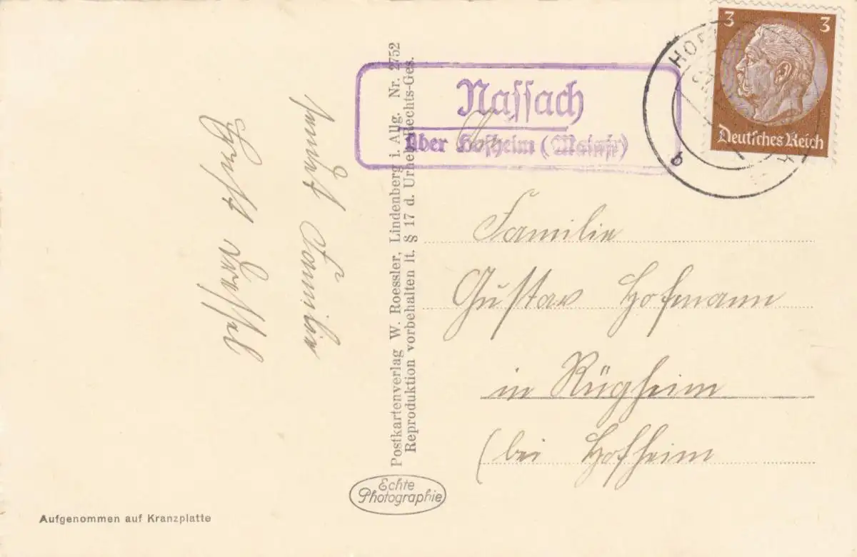 Carte postale 1936 Nassach par Hofheim/Main vers Rügheim