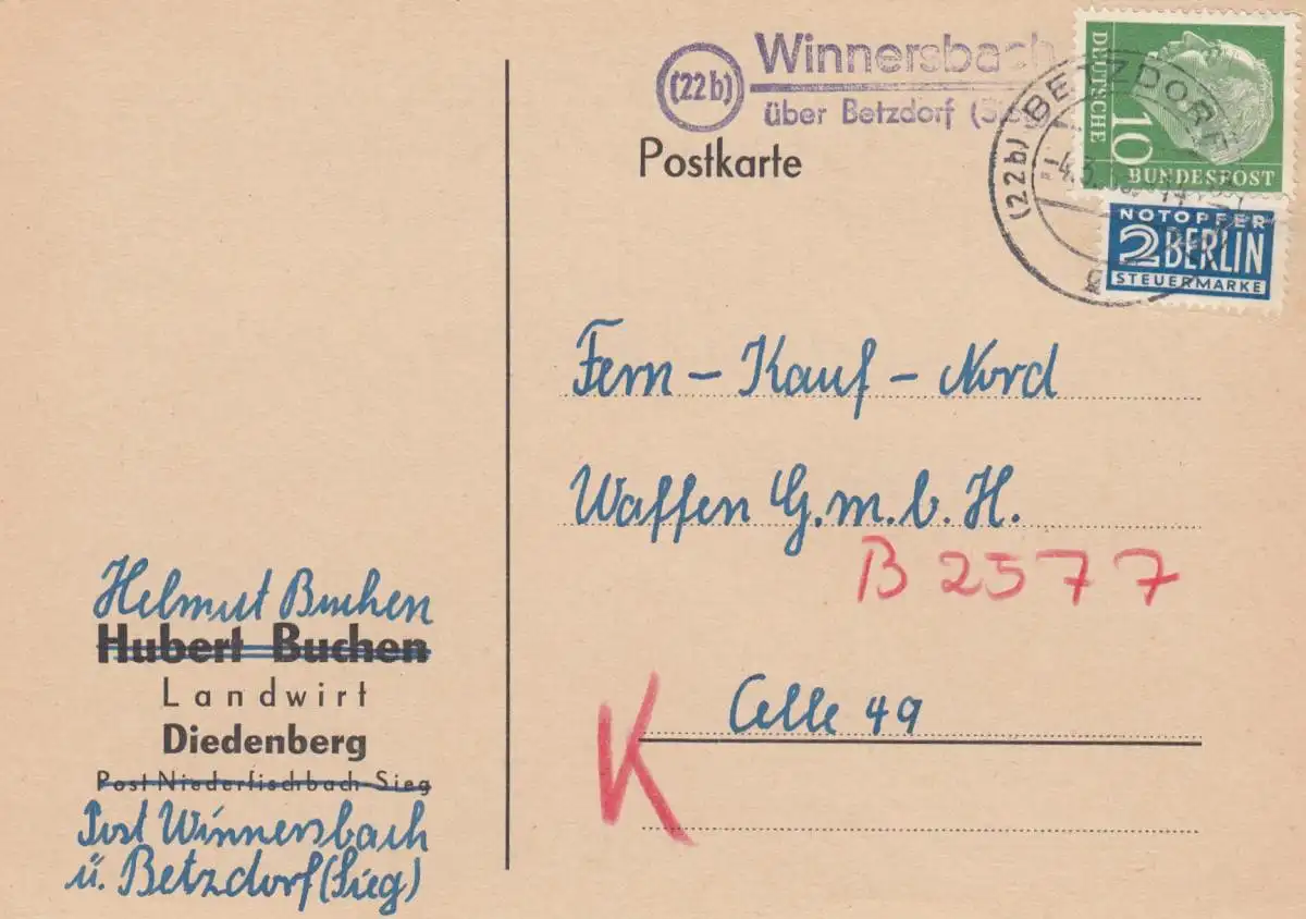 Carte postale 1955 Winnersbach via Betzdorf vers Celle