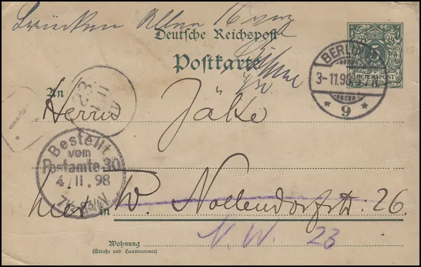 Carte postale 5 pf. chiffre comme carte postale locale BERLIN 9 - 3.11.98 par bureau de poste 30