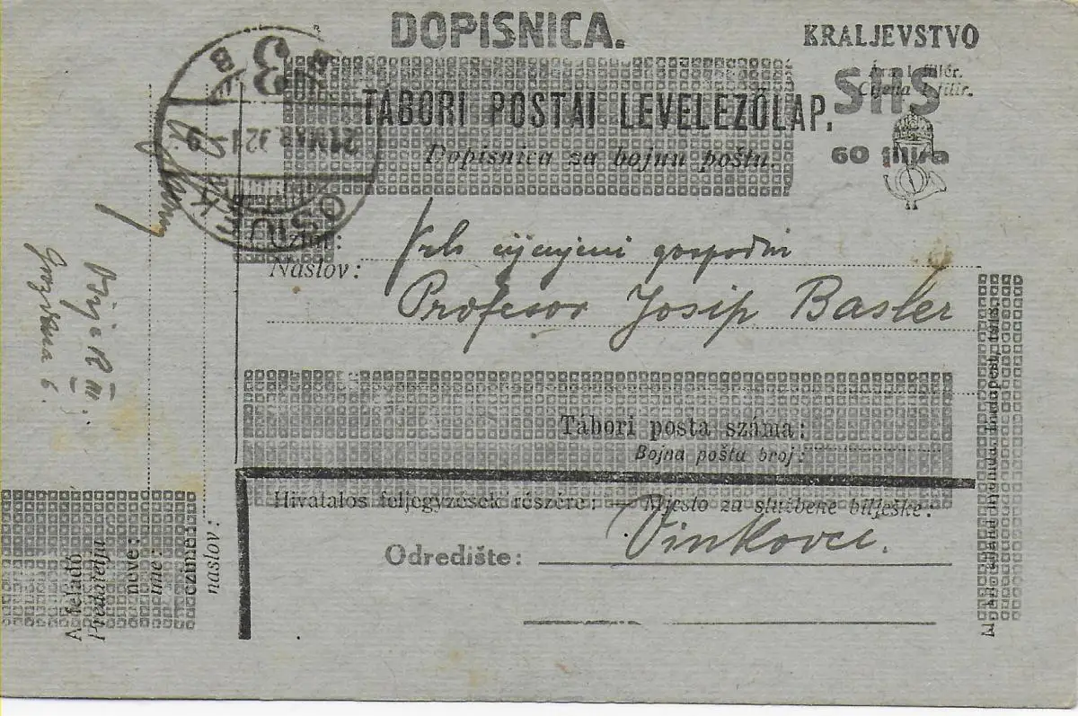 Carte postale Dopisnica Kralievstvo SHS de Osijek à Vinkovci, 1921