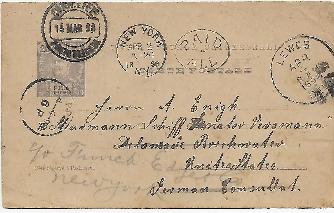 Carte postale Lewes, 1898 Ponta Delgado après le consulat de New York