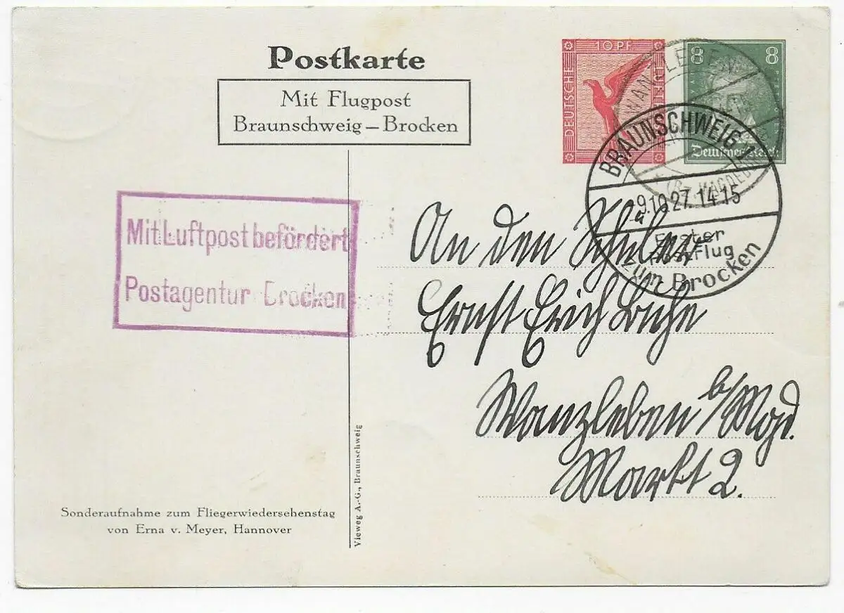 Carte postale Post Agence postale Brocken: Braunschweig-Brockens, Wanzleben, 1927