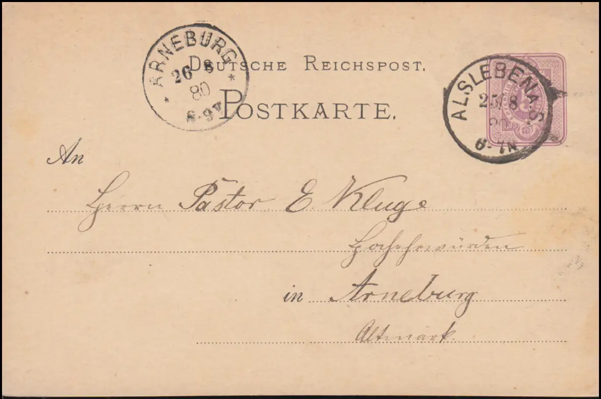 Carte postale P 10 chiffre 5 pfennig, ALS VIE A.S. 25.8.1880 après ARNEBOURG 26.8.80