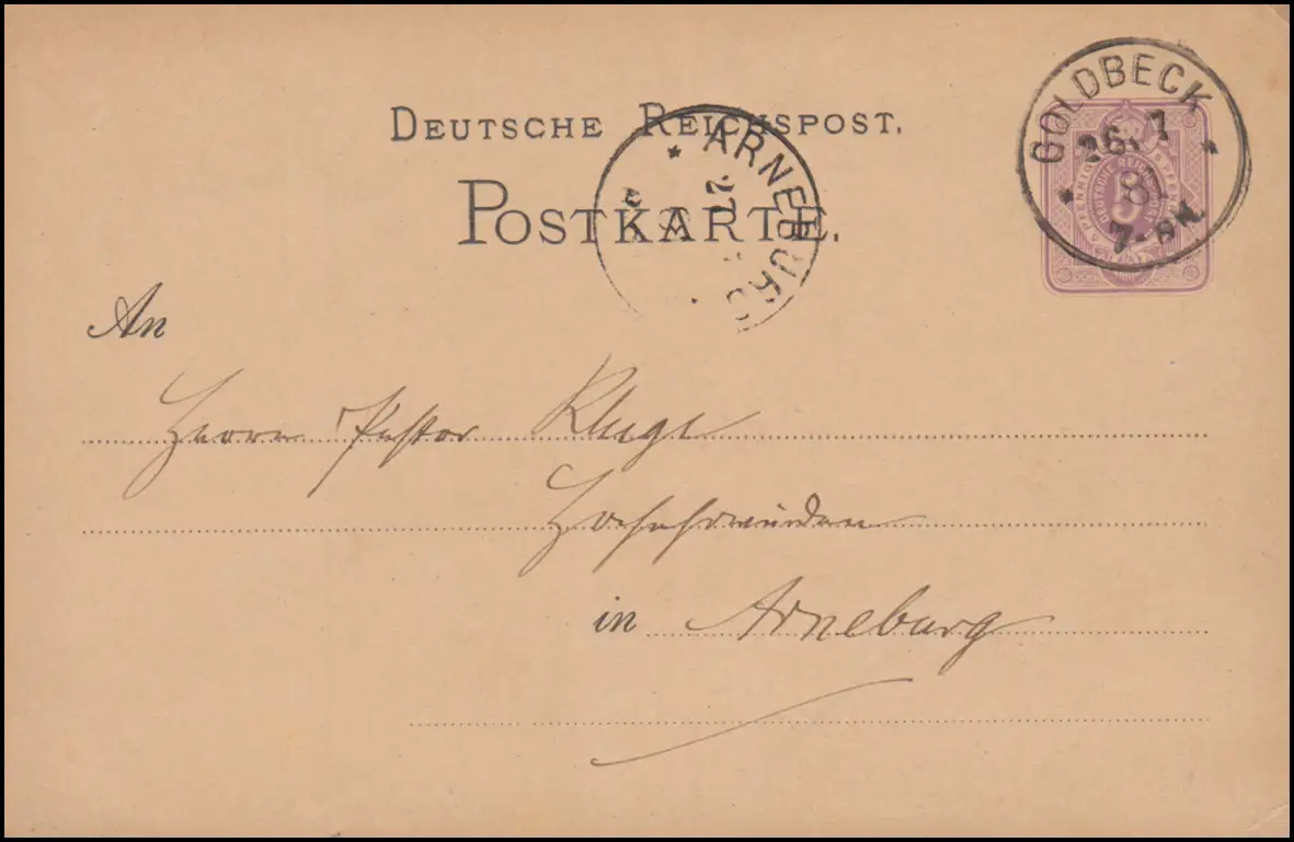 Carte postale P 10 chiffre 5 pfennig, en cercle GOLDBECK 26.7.1881 vers ARNEBURG 27.7.