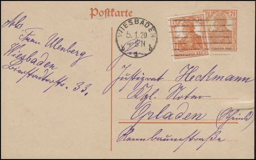 Carte postale P 110I avec 99 Germania de WESADADE 1b - 5.1.20 à Opladen