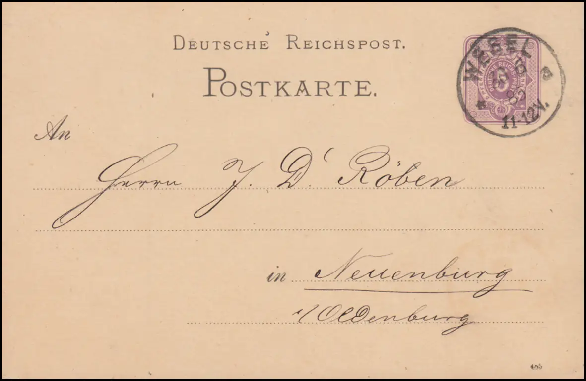 Carte postale P 12/02A paragraphe 5 Pfennig DV 485, WESEL 30.6.1885 vers Neuchâtel