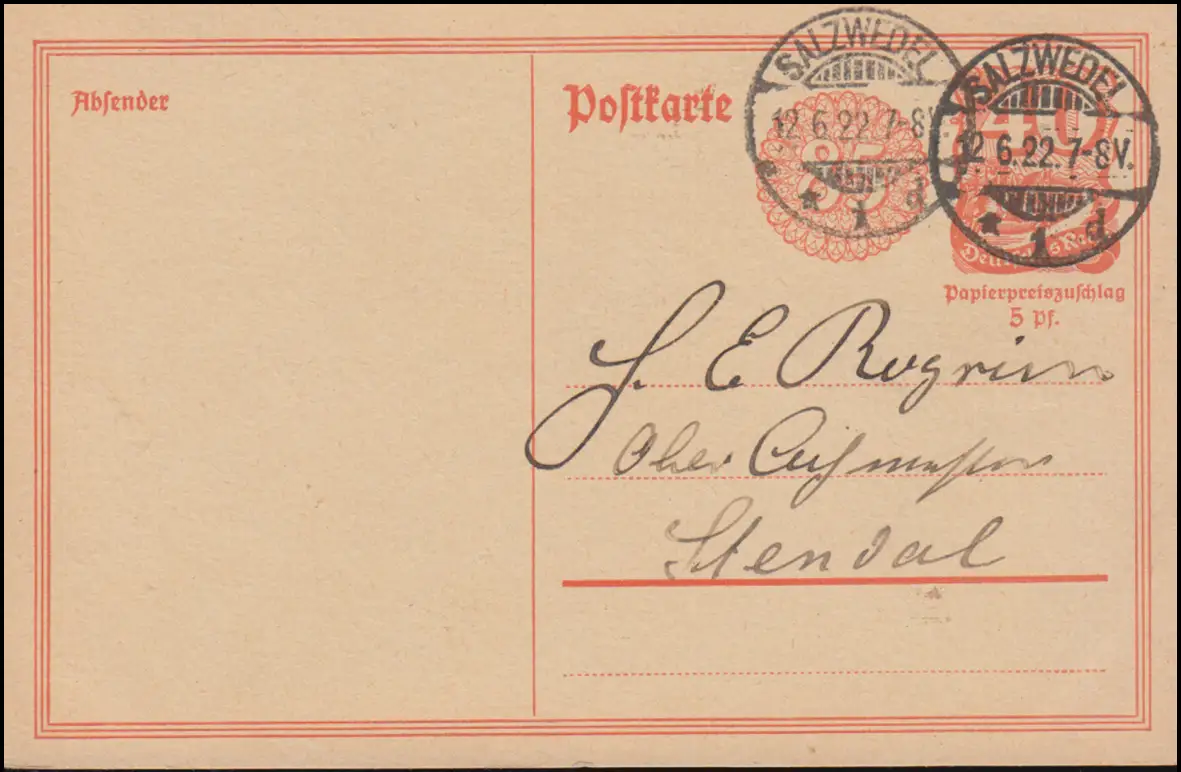 Carte postale P 153I Poseier avec l'impression rosette SALZWEDEL 12.6.22 vers Stendal
