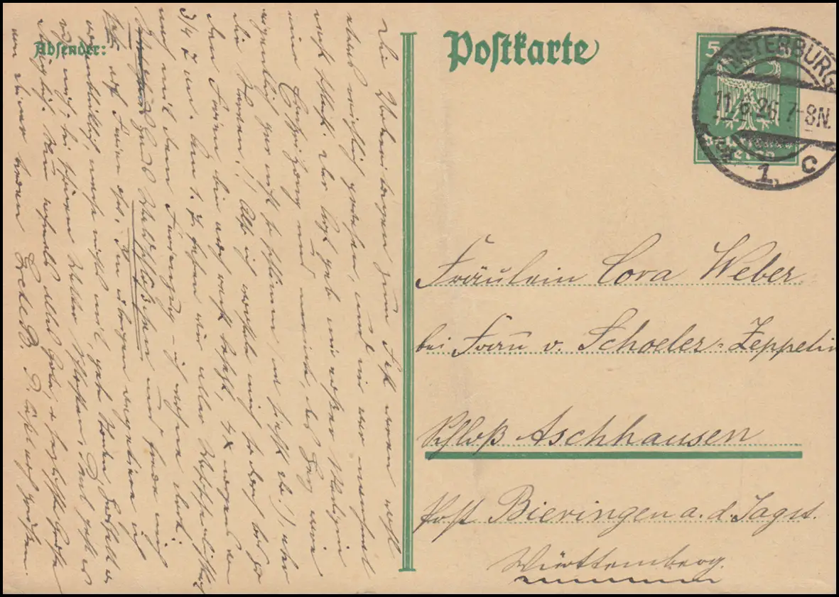 Carte postale P 156I Adler 5 Pf. couru INSTERBURG 11.6.26 vers Gross Aschhausen