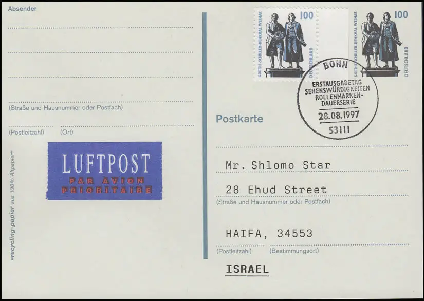 Carte postale P 157 Monument Goethe Schiller +1934A SWK Airpost-FDC ESSt Bonn