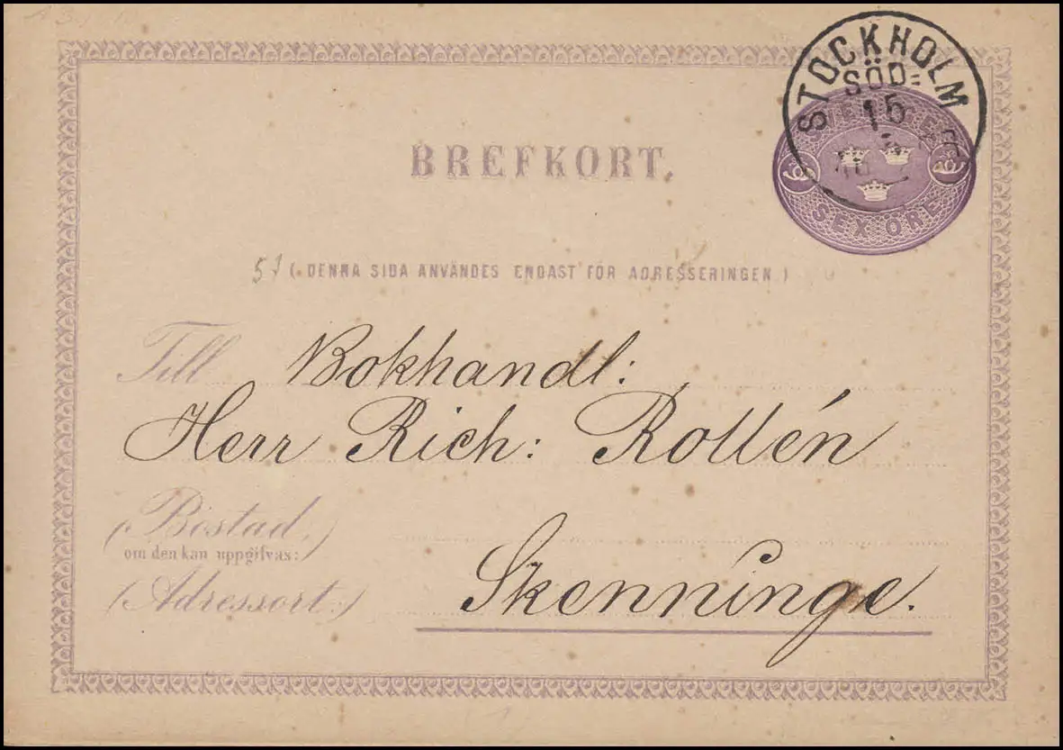 Carte postale P 1D BREFFORT 6 Öre, STOCKHOLM SÖD 15.2.1878 par Skenninge