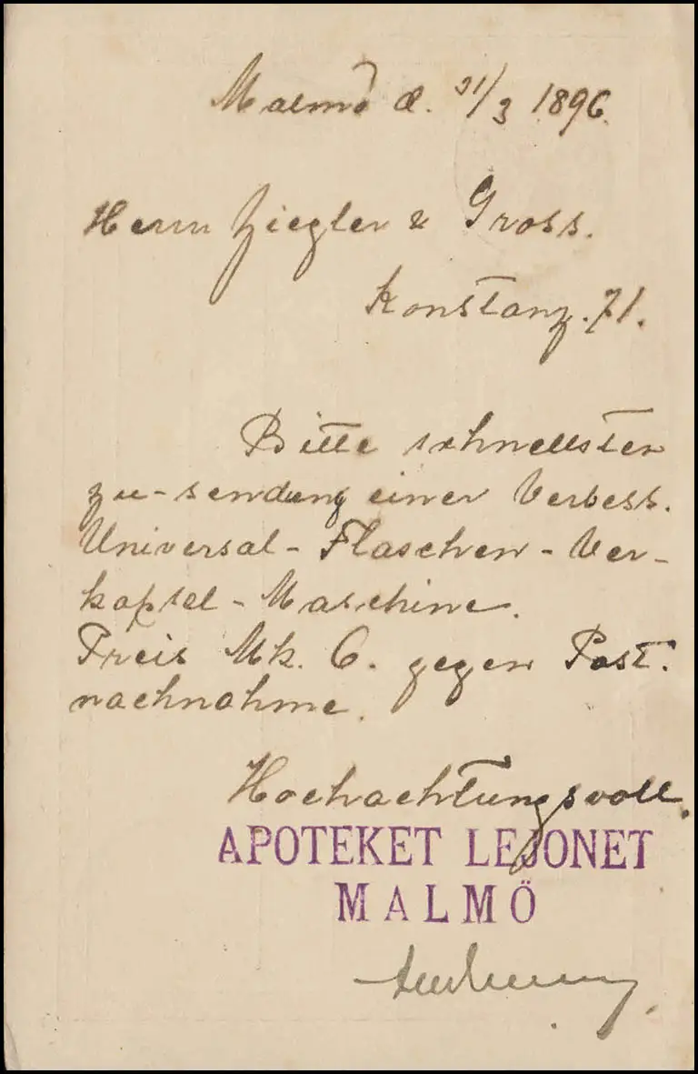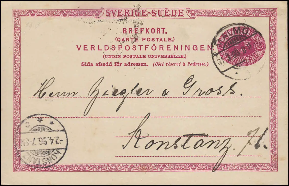 Carte postale P 20 SVERIGE-SUEDE 10 Öre, MALMÖ 31.3.1896 selon CONSTANZ 2.4.96