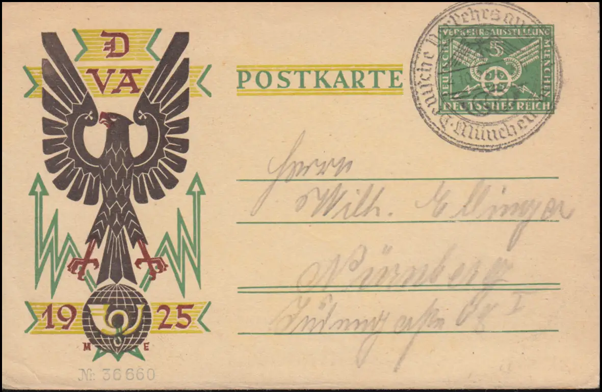Carte postale spéciale pour l'exposition allemande de transport à Munich en 1925; carte avec numéro de comptage 36660, avec cachet spécial MICHEL Numéro 2: Aigle d'armoirie / 2 cornes postales Numéro de catalogue: P206IIb Vérification: original Référence produit: 00000000037547>Remarque: Cet article n'est disponible qu'une fois. Vous recevrez exactement l 'article illustré.
