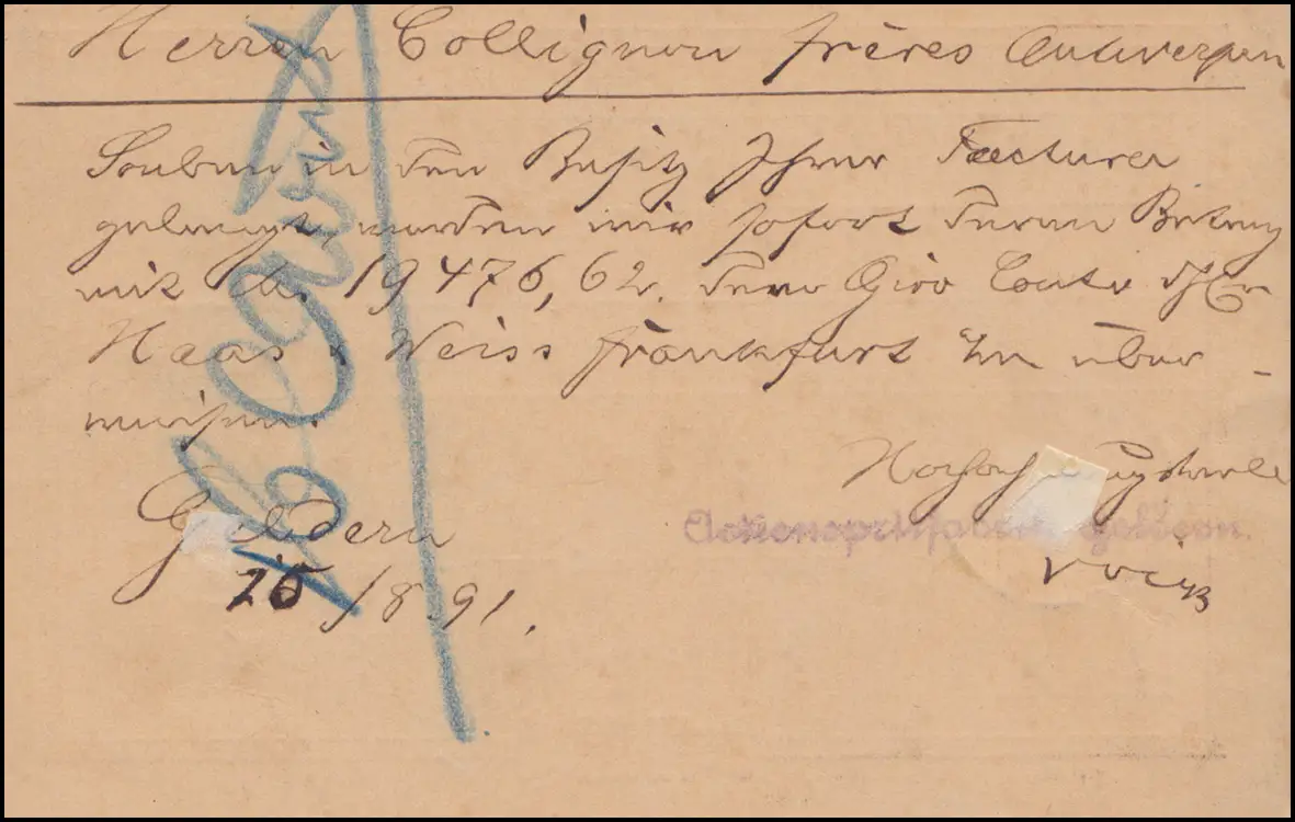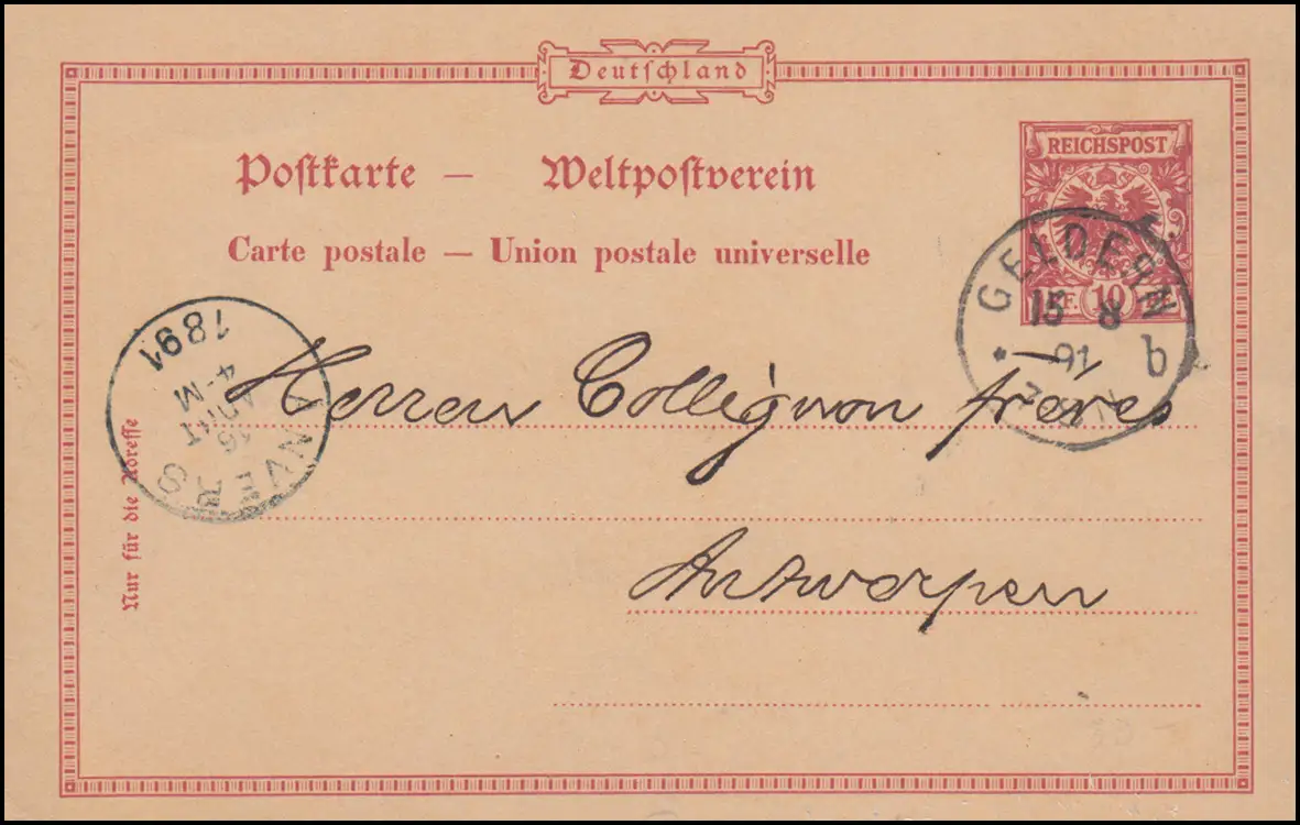 Carte postale P 25/01 avec DV 491 l de GELDER 15.8.91 vers ANVERS 16.8.1891