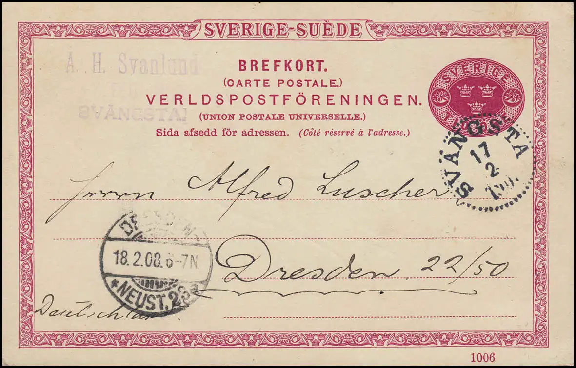 Carte postale P 25 SVERIGE-SUEDE 10 Öre avec DV 1006, SVANGSTA 17.2.1908 vers DRESDEN