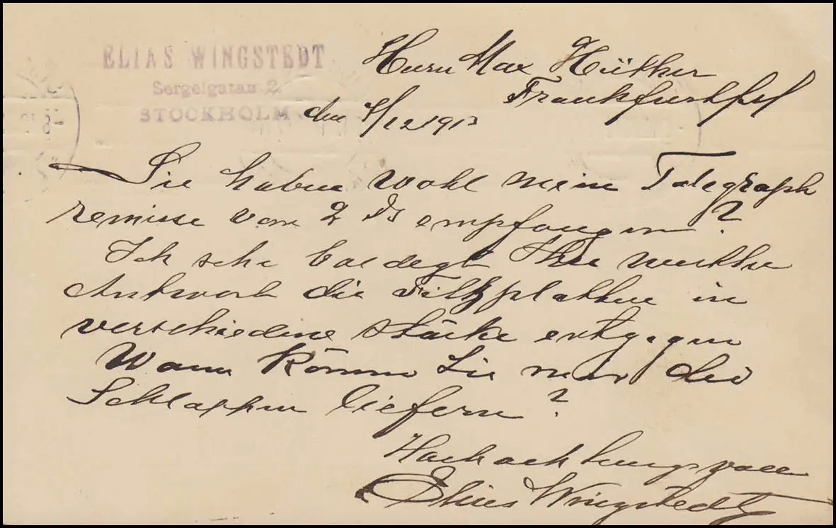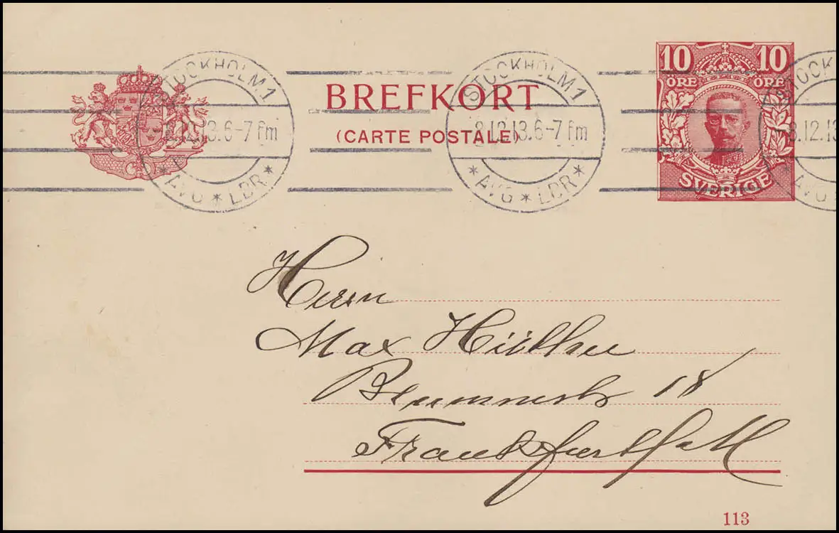 Carte postale P 30 BREFFORT 10 Öre Date d'impression 113, STOCKHOLM 8.12.13 n. Francfort/M.
