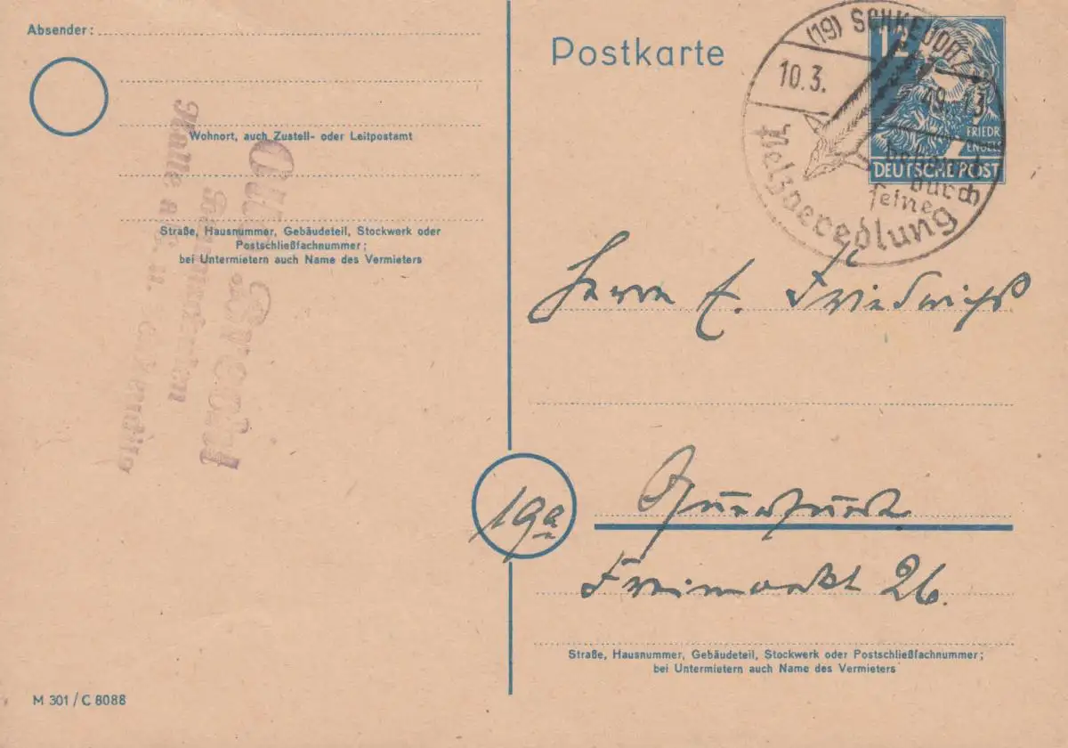 Carte postale P 36a/01 Engels 12 Pf. DV M 301 / C 8088, SSt SCHKEUDITZ Pelotes 10.3.53