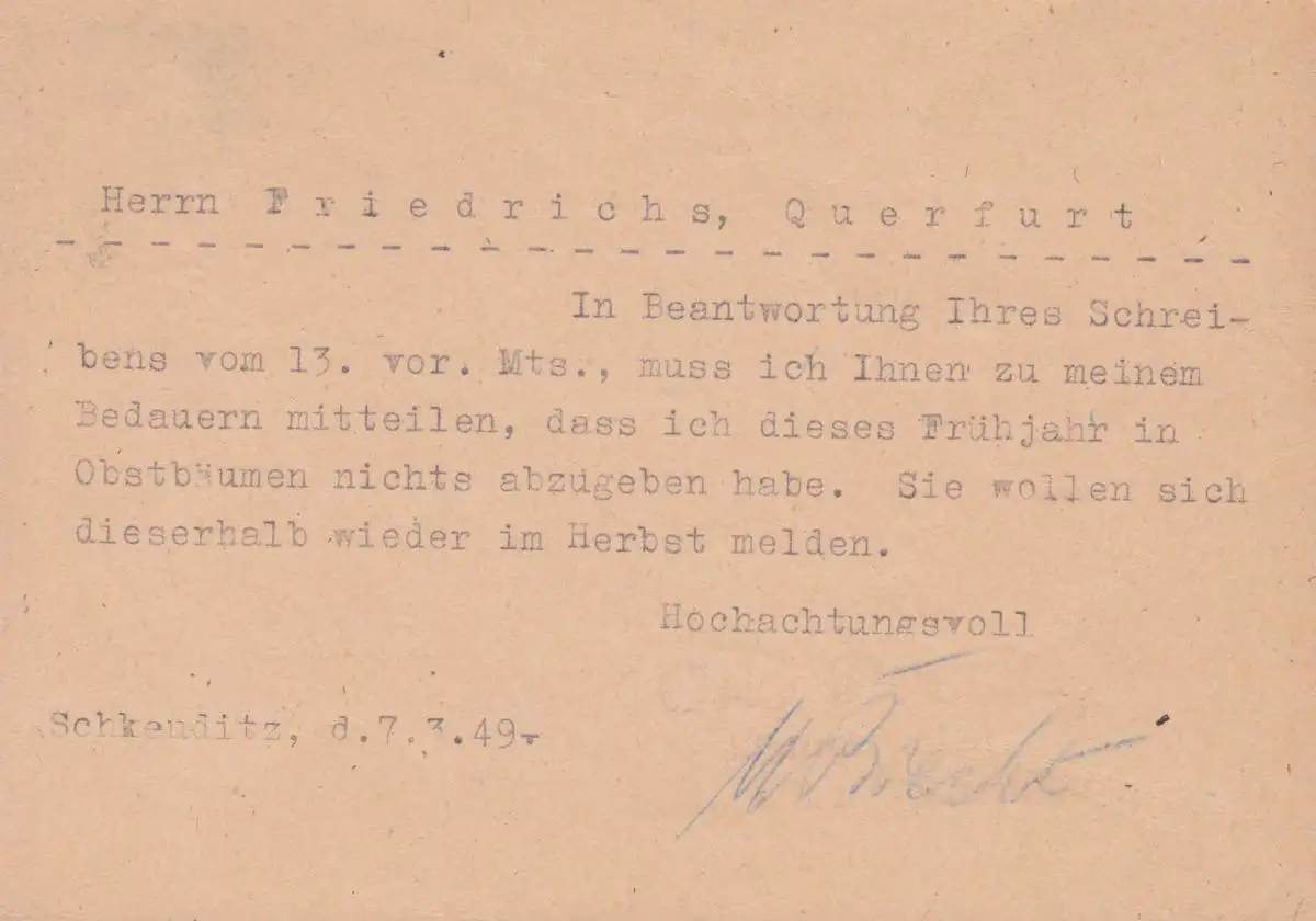 par Firma Otto Brecht - Pépinières - selon Querfurt, timbre spécial SCHKEUDITZ connu par la finition fine de fourrure 10.3.1953 Numéro de catalogue: P36a/01 Examen: original Référence produit: 00000000041328>Remarque: Cet article n'est disponible qu'une seule fois. Vous recevrez exactement l'article représenté.