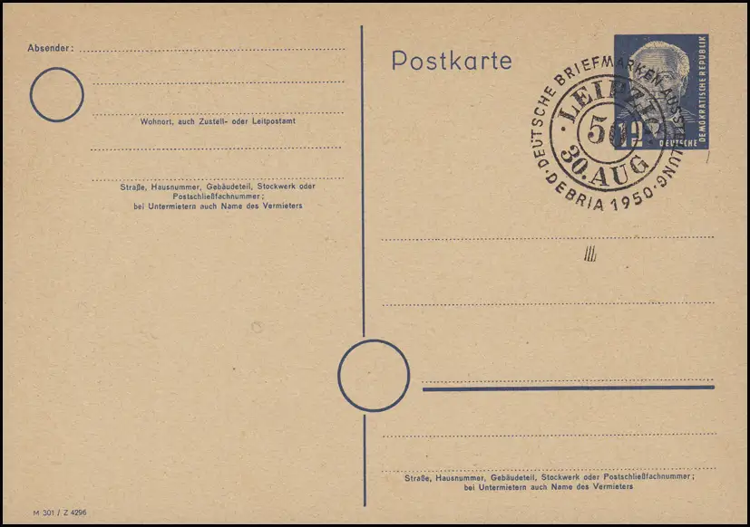 Carte postale P 45/1 Pieck 12 Pf. DV M 301 Z 4296 avec SSt LEIPZIG DEBRIA 30.8.50