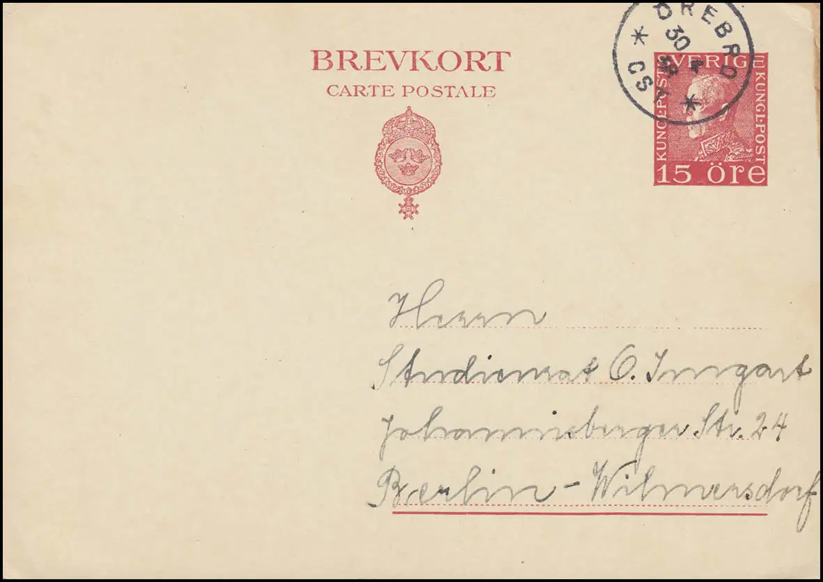 Carte postale P 50 Roi Gustav 15 Öre, ÖREBO 30.4.1938 vers Berlin/Deutschland