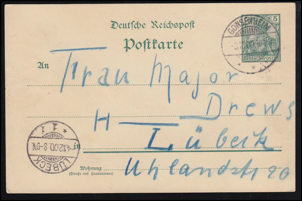 Carte postale P 50II Reichspost de GONSENHEIM 3.12.1900 vers LÜBECK 4.12.00