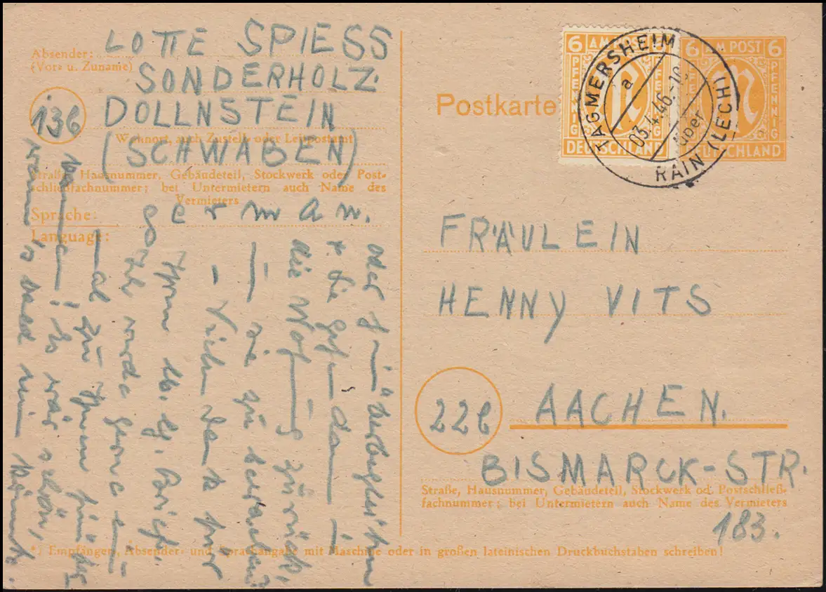 Carte postale P 905 AM-Post + 13 AM Post MiF TAGMERSHEIM via RAIN (LECH) 3.4.46