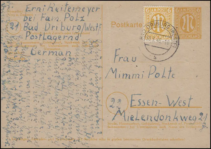 Carte postale P 905 avec armoire supplémentaire BAD DRIBURG (WESTF) 30.3.46 après repas