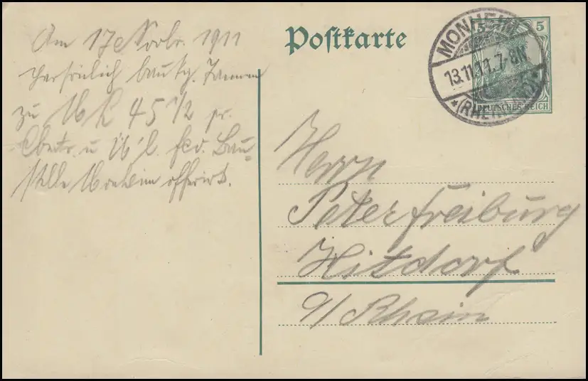 Carte postale P 90I Germania 5 Pf. MONHEIM / RHEINLAND 13.11.11 vers Hitdorf