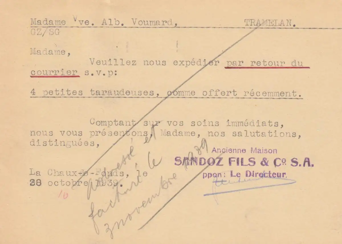 Carte postale Sandoz Chaux de Fonds to Tramelan 1939
