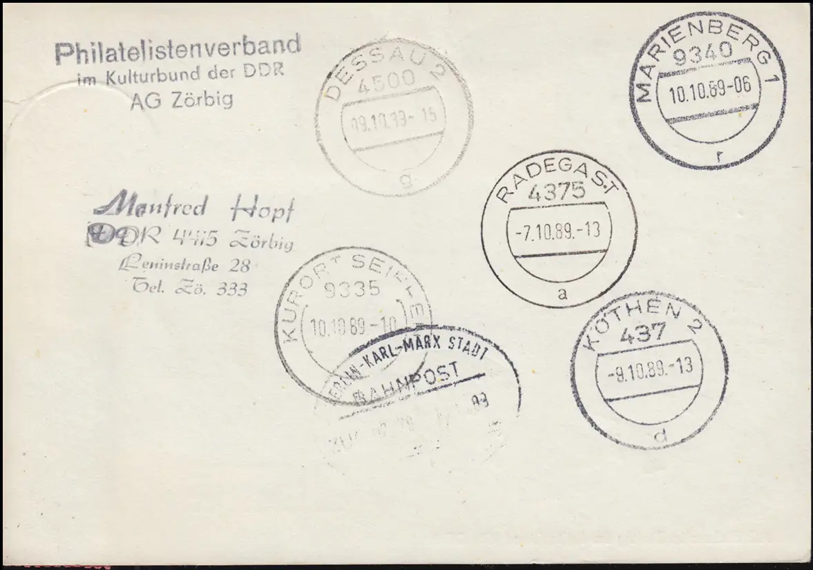 Post-Cutchenpost Zörbig - Radegast Kursächsische Distantekollung ZÖRBIG 7.10.1989