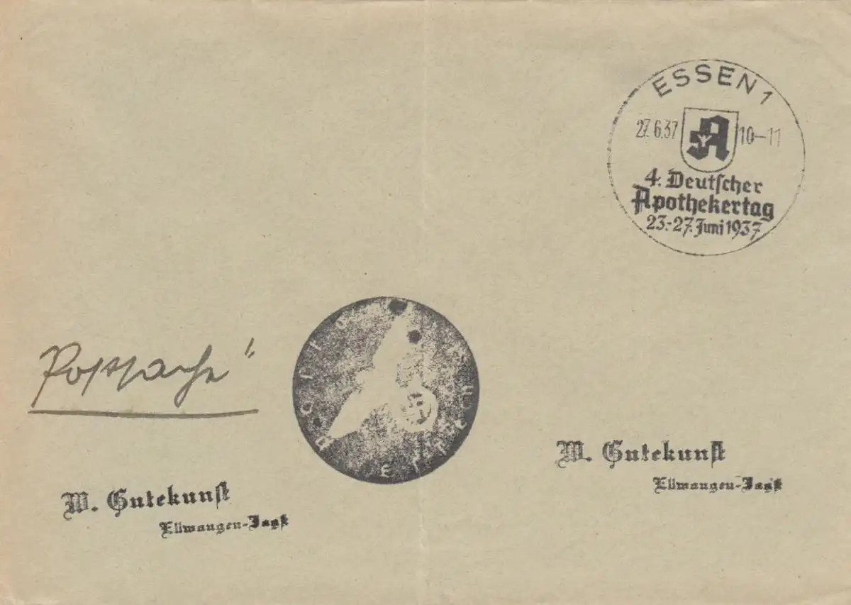 Affaire postale Kuvert 1937: Essen: 4ème jour de pharmacien allemand