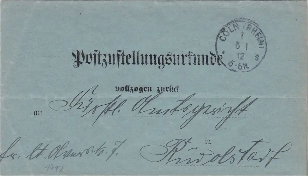 Post-addote Cologne 1912 vers Rudolstadt