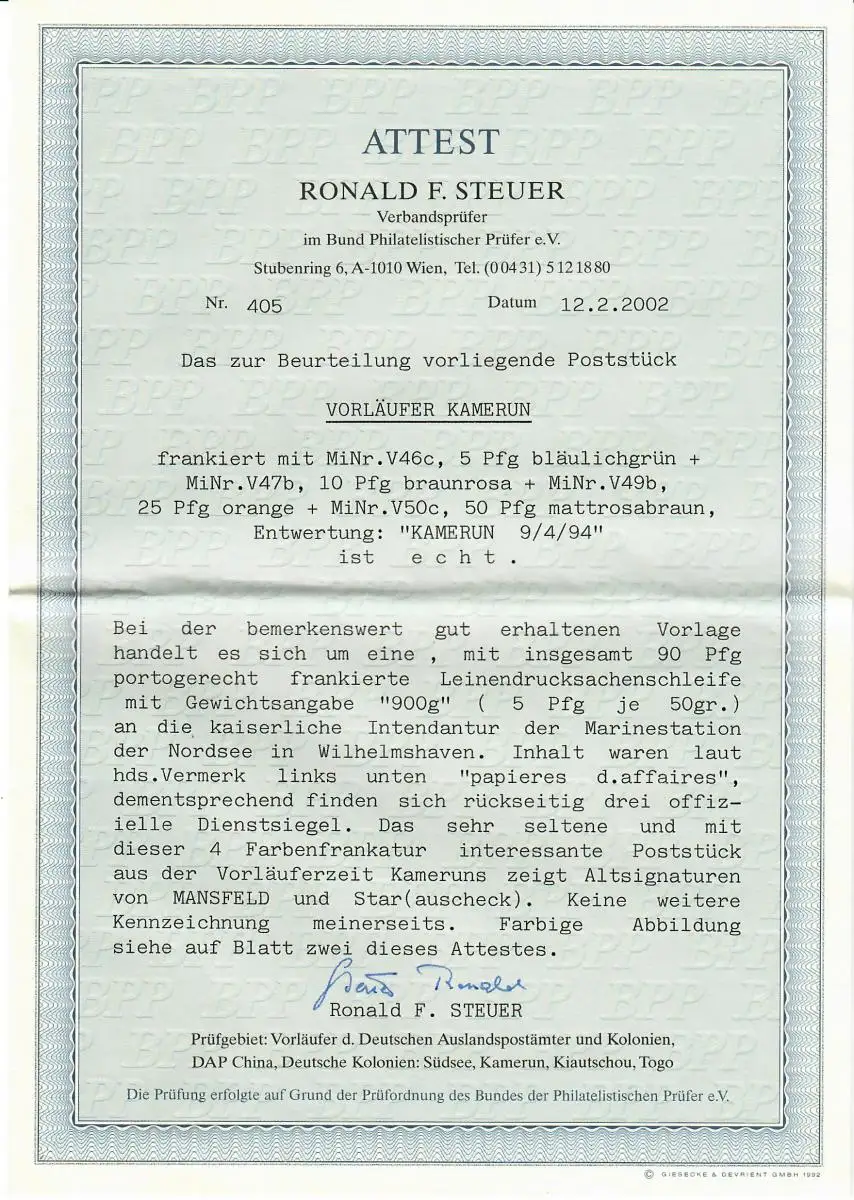 Voir Scan: Décoration de 4 couleurs Frankatur, Cameroun sur toile boucle d'impression 900g et note papier d ' affaires à l' intention de la station navale de Wilhelmshaven, avec des cachets arrière. Attention photo: remarquablement bien conservé, très rare, pièce postale intéressante. Art.No.: 5002025 Examen: Atest BPP Référence produit: 00000005002024