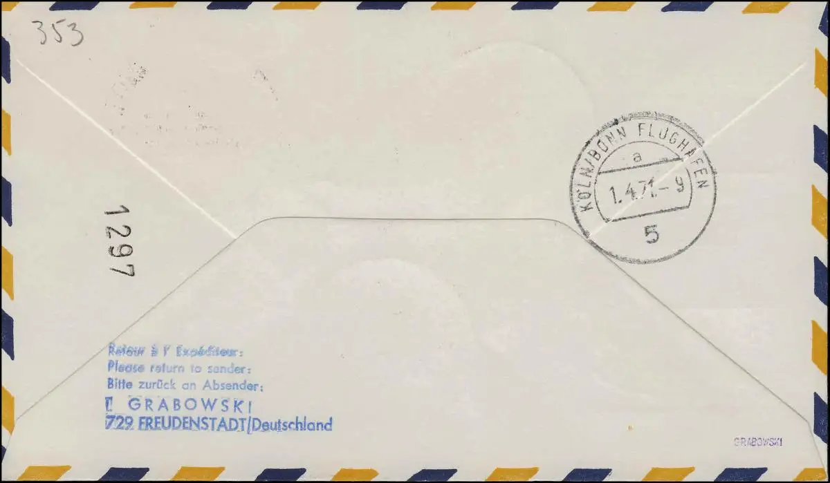 Premier vol à l'occasion du passage de la ligne à Boeing 737 entre Nuremberg et Cologne (Bonn). Timbre pourpre "non appelé" au verso Taste 1397 + Tampon d'arrivée Cologne. Examen: original Numéro d 'article: 00000000040539>P>Remarque: Cet article n'est disponible qu'une seule fois. Vous recevrez exactement l \' article représenté.
