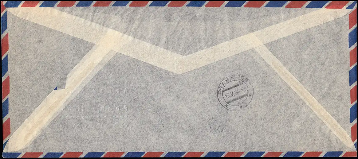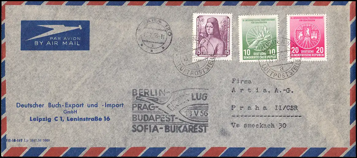 Tampon noir "Première vol Berlin-Prague-Budapest-Sofia- Bucarest 13.V.56," timbre d'arrivée PRAG / PRAHA 13.5.56, francature: 506 peintures et 521522 Paix / distance cyclable Numéro de catalogue: 5006+521-522 Examen: original Numéro d ' article: 00000000013433
