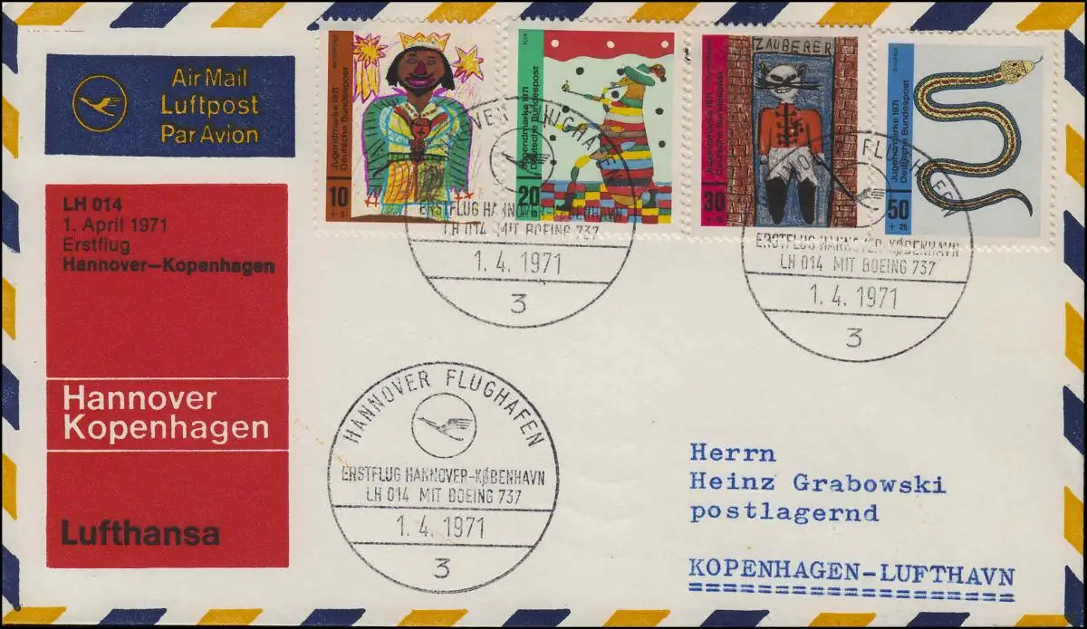 Premières liaisons aériennes Lufthansa LH 014 Boeing 737, Hanovre / Copenhague 1.4.1971