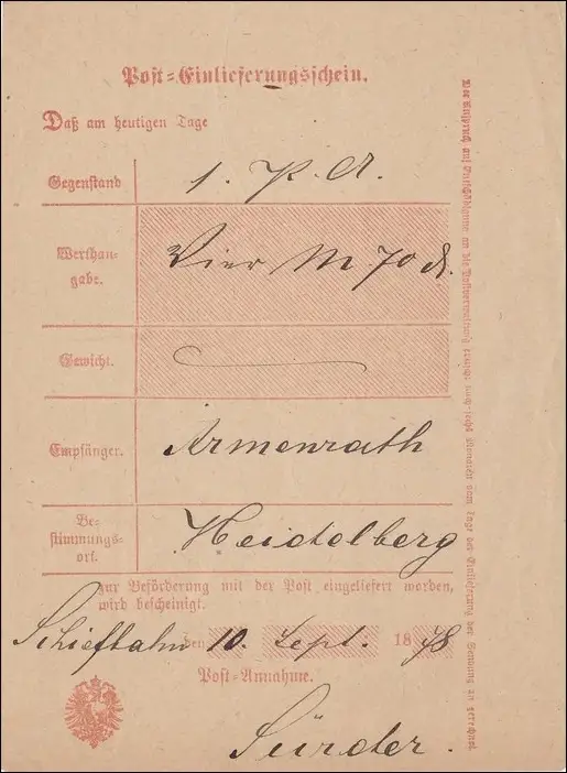 Prusse: bulletin de livraison de Schiefbahn 1878
