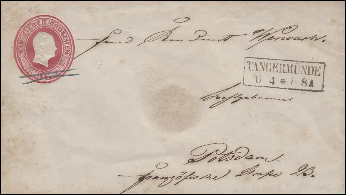Prusse Enveloppe 1 Sgr. rose, cachet de caste TANGERMÜNDE 26.4. vers Potsdam 27.4.
