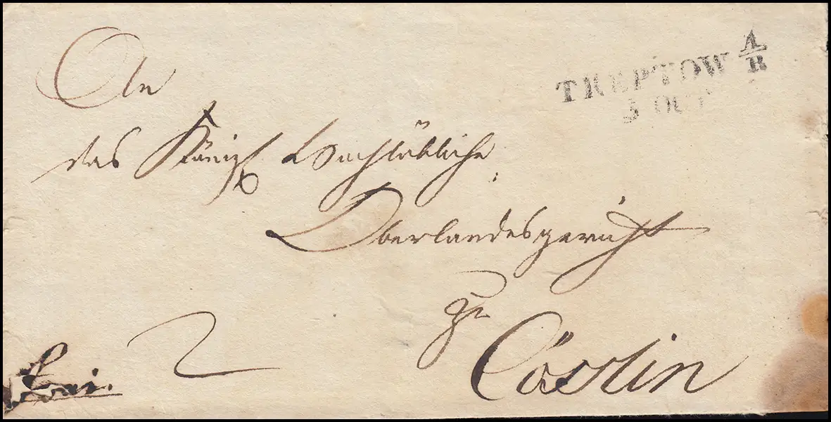 Prusse Vorchilatelie Coque de lettre TREPTOV A.R. 3.10. vers Cöslin