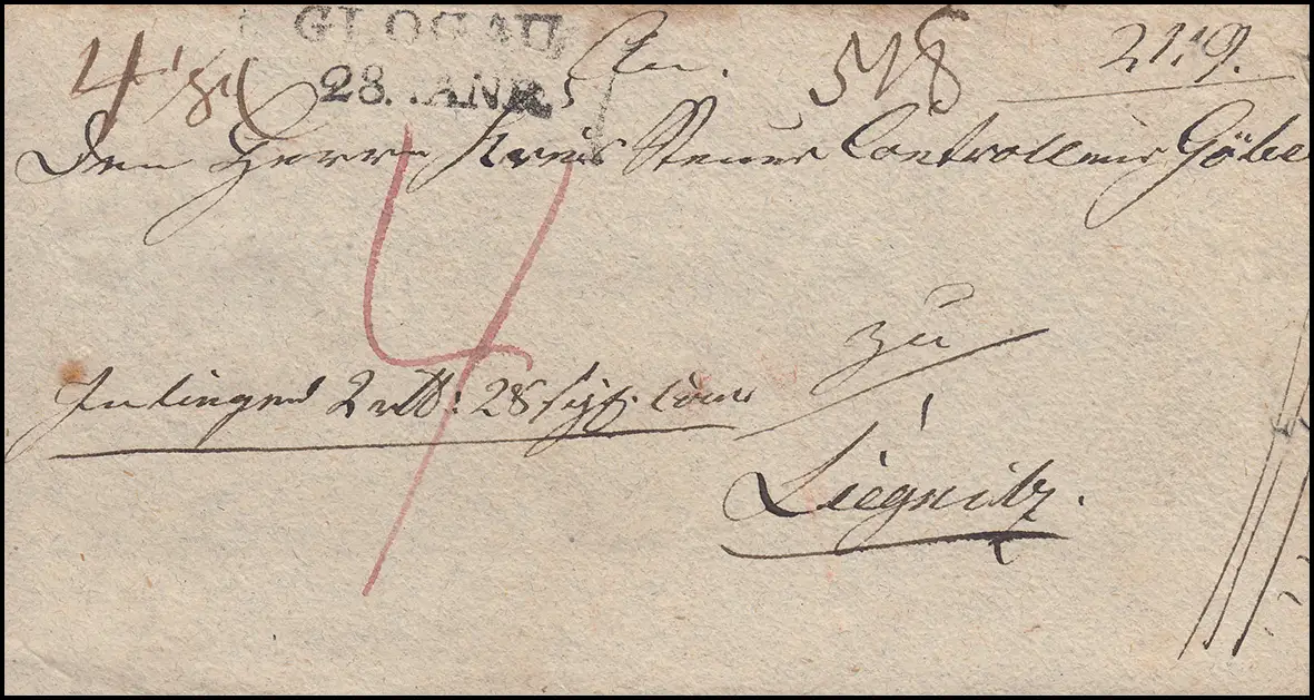 Prusse Vorphilatelie Avant-Première Bizeiler GLOGAU 28. JANR. après Liegnitz