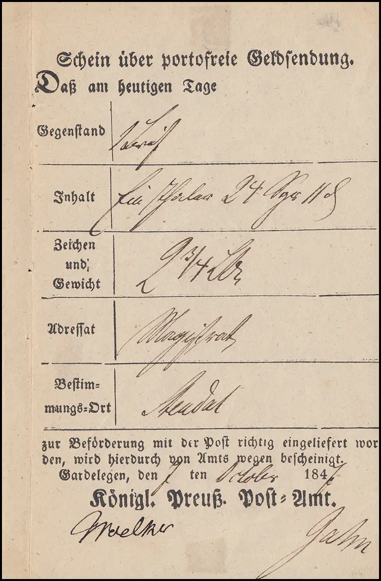Prusse Vorphilatelie Certificat de livraison Lettre d'accompagnement des fonds Gardelegen 7.10.1847