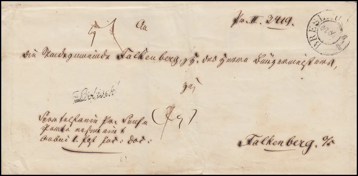 Prussen Vorphilatelie Lettre d'accompagnement de colis à deux cercles BRESLAU 3.3. vers Falkenberg