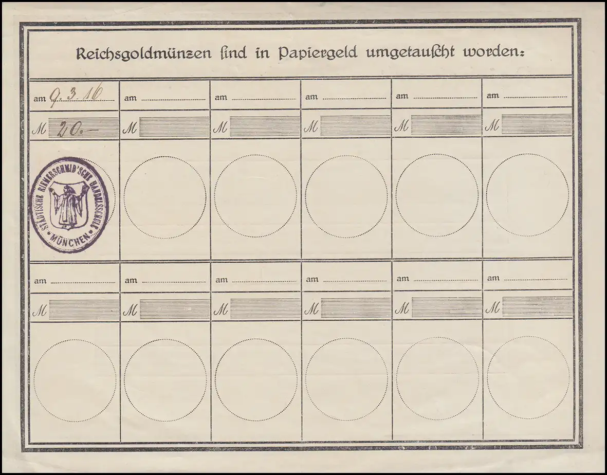 Preuve: Pièces d'or Reichs ont été échangées en monnaie papier, Munich 9.3.16