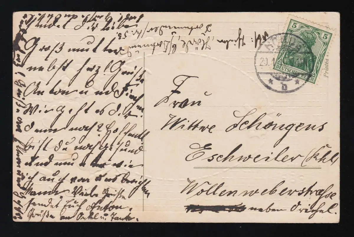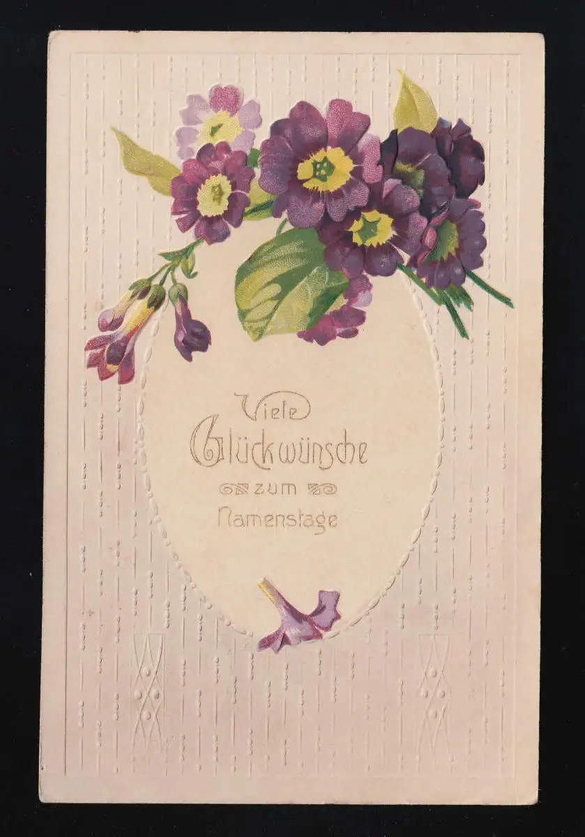 Primeln bouquet jaune violet rempli, félicitations pour le jour du nom, Audence 20.1.1910