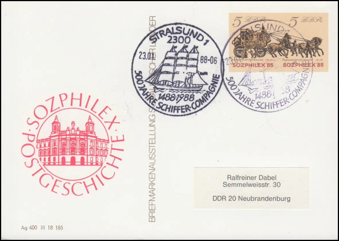 Carte postale privée P 93 SOZPHILEX 1983, SST STRALSUND Schiffer-Compagnie 23.01.1988