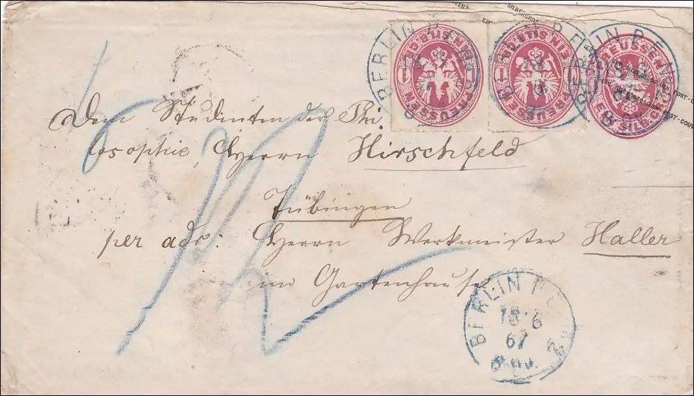 Prusse: Enveloppe complète de Berlin à Tübingen 1867