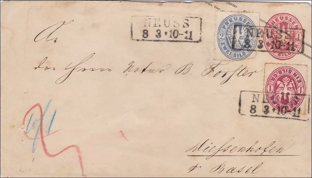 Prusse: Enveloppe de Neuss à Wiesenhofen (Basel) 1889