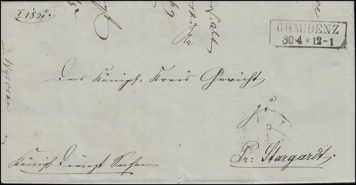 Prusse Vorphilatelie Bf GRAUDENZ 30.4.1867 à Preuss. Stargard et retour 1869
