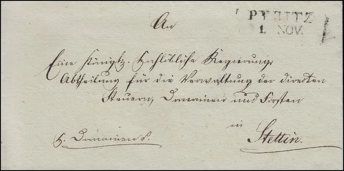 Prusse Vorphilatelie Coque à lettres bi-bi-latéral L2 PYRITZ 1er NOV. vers Szczecin 2.11.