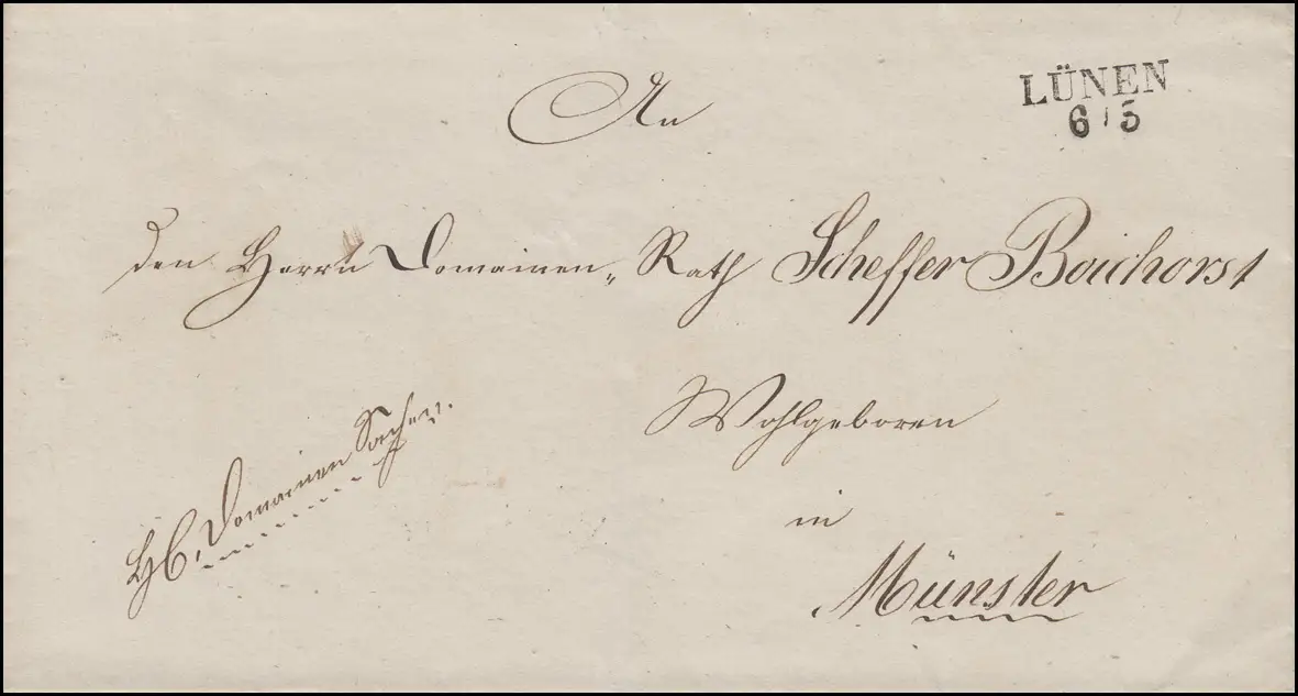 Prusse Vorphilatelie Coque de lettre bi-bi-zeiler LÜNEN 6.5. selon Münster 8.5.