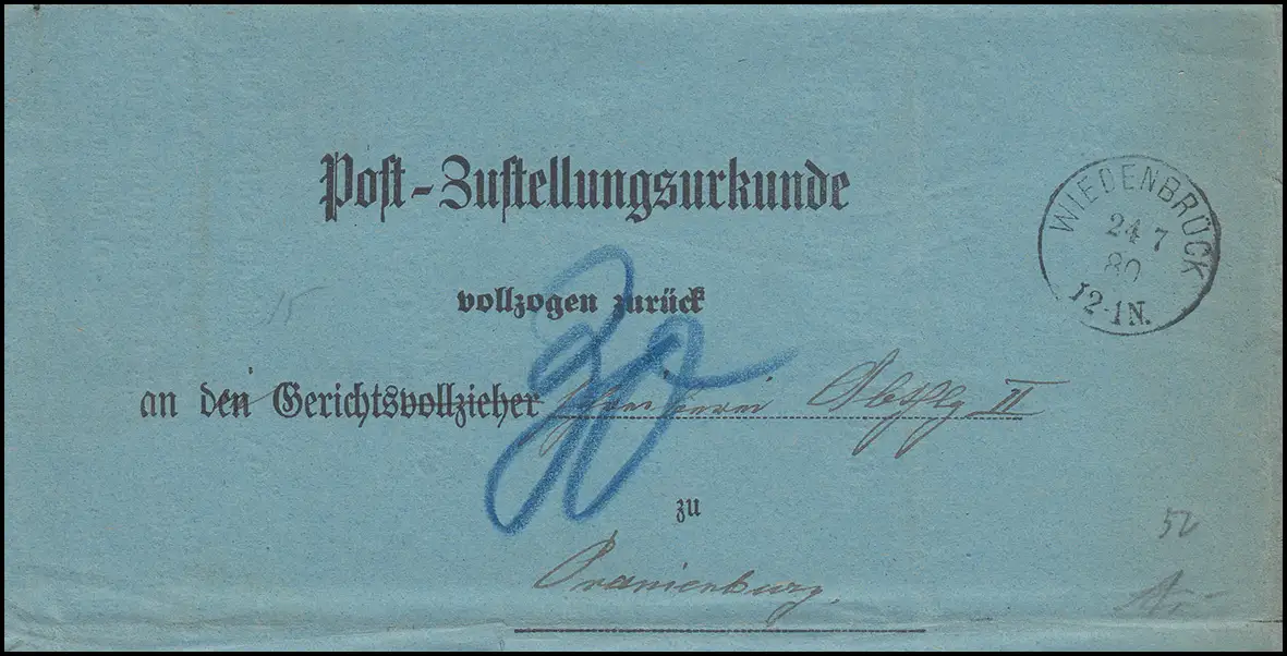 Prusse acte de livraison postal Einkreis WIEDENBRÜCK 24.7.80 vers Oranienburg